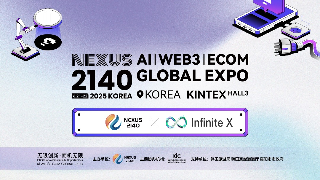 Infinite X 即将闪耀登场 Nexus2140 全球博览会 - 韩国站图片分享2025年6月21日至22日,Infinite X将荣耀亮相于韩国高阳市KINTEX会展中心举办的Nexus2140全球博览会。此次博览会由Nexus2140精心策划,并得到了韩国旅游局、京畿道道厅及高阳市政府的鼎力支持。全球各地的科技巨头、投资机构、业界翘楚及新锐品牌将齐聚一堂,共同探索人工智能(AI)、Web3.0及跨境电商(ECOM)三大领域的融合创新与未来趋势。预计将有3至5万名专业观众、超过500家参展企业、150多位投资者、3000多名关键意见领袖(KOL)及400余家媒体聚焦此次盛会。